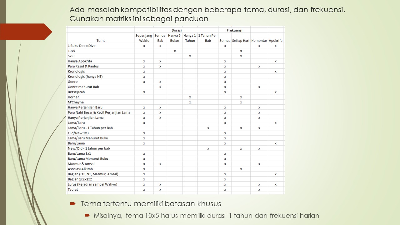 Tema ini adalah variasi dari tema Genre yang dirancang oleh pemohon. Setiap hari, tergantung pada jumlah bab per hari yang Anda pilih, membaca 7 genre yang berbeda (Epistola, Hukum, Sejarah, Mazmur, Puisi, Nubuat, dan Injil). Lihat Contoh Jika Anda memilih 1 bab per hari, Anda akan membaca satu bab dari "Surat-surat" pada hari pertama dan satu bab dari "Hukum" pada hari berikutnya, dan seterusnya. Jika Anda memilih 2 bab per hari, Anda akan membaca satu bab dari "Surat-surat" dan "Hukum" pada satu hari, kemudian Sejarah dan Mazmur pada hari berikutnya, dan seterusnya.