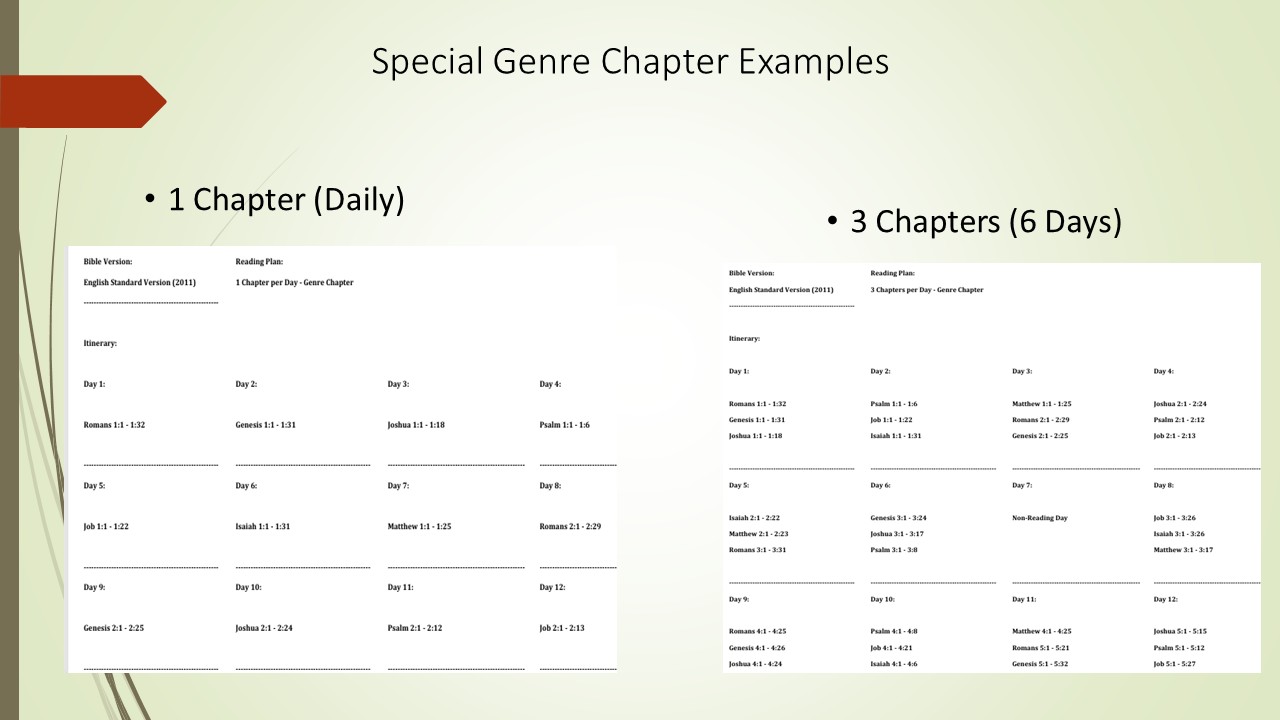 Ова тема је варијација обичне теме Жанр дизајниране од стране тражиоца. Сваког дана, у зависности од броја поглавља на дан које изаберете, прочитати 7 различитих жанрова (Епистоле, Закон, Историја, Псалми, Поезија, Пророчанство и Јеванђеље). Видети Пример Ако изаберете 1 поглавље дневно, прочитаћете једно поглавље из "Епистола" једног дана и једно поглавље из "Закона" следећег дана, итд. Ако изаберете 2 поглавља дневно, прочитаћете једно поглавље из "Епистола" и "Закона" једног дана, затим Историју и Псалме следећег дана, итд.