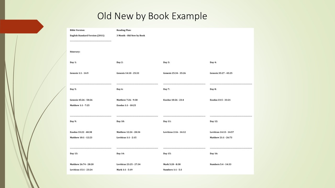 Развијао је захтевач WBP. Сличан Старом/Новом плану; алтернативно читање читавих књига у Старом и Новом завету. Прочитај целу књигу Постања. Затим прочитај целу Матеју. Затим прочитајте читав Излазак, итд. Видети Пример
