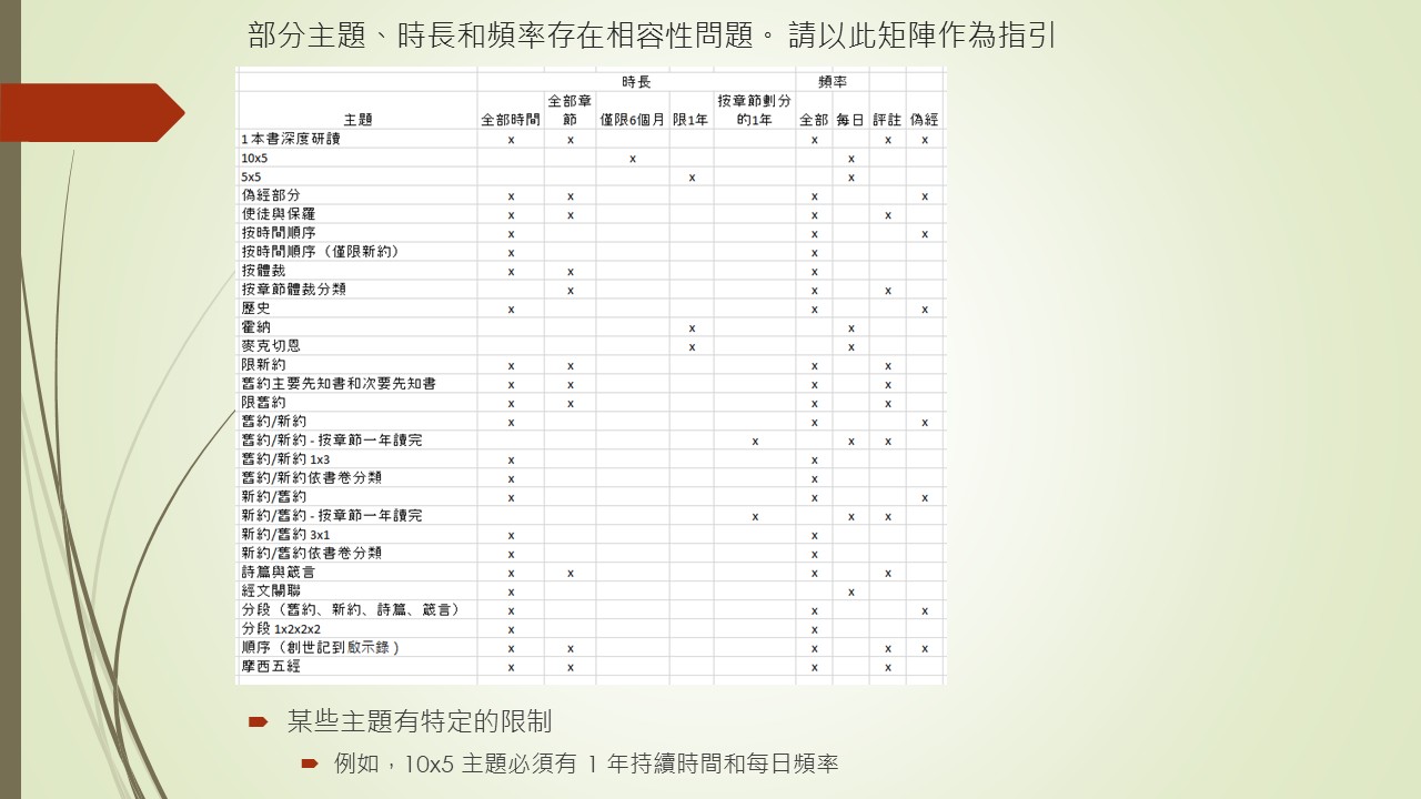 本頁面解釋了我們提供的類別和選項。 " 制定閱讀計劃 " 此頁面旨在幫助您自訂閱讀計劃。